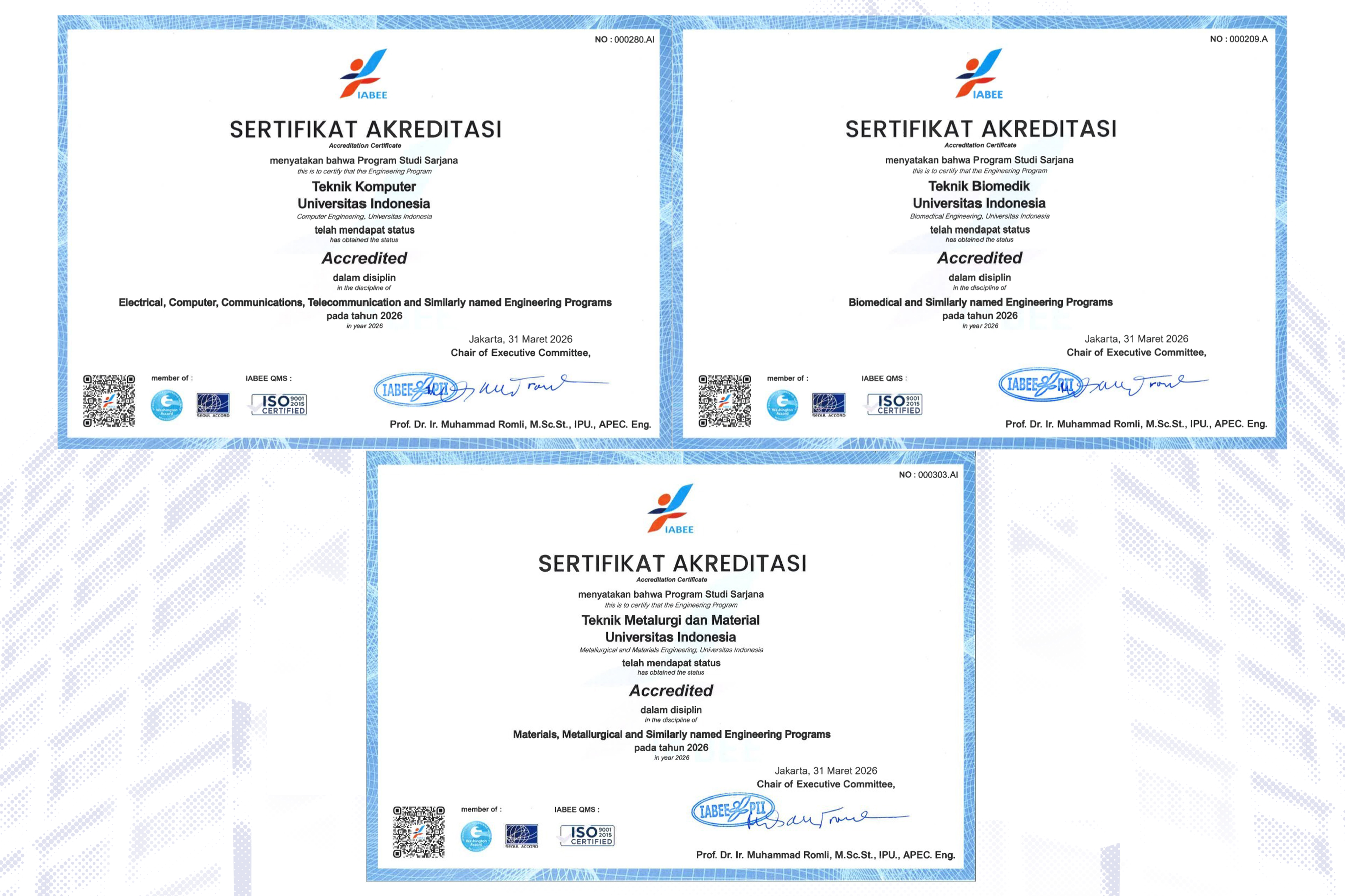 Fakultas Teknik Universitas Indonesia (FTUI) kembali mencatatkan capaian strategis dalam penguatan mutu pendidikan teknik di tingkat internasional. Program Studi Sarjana Teknik Komputer, Program Studi Sarjana Teknik Biomedik, serta Program Studi Sarjana Teknik Metalurgi dan Material resmi memperoleh status Accredited dari Indonesian Accreditation Board for Engineering Education (IABEE) pada tahun 2026. Program Studi Sarjana Teknik Komputer...