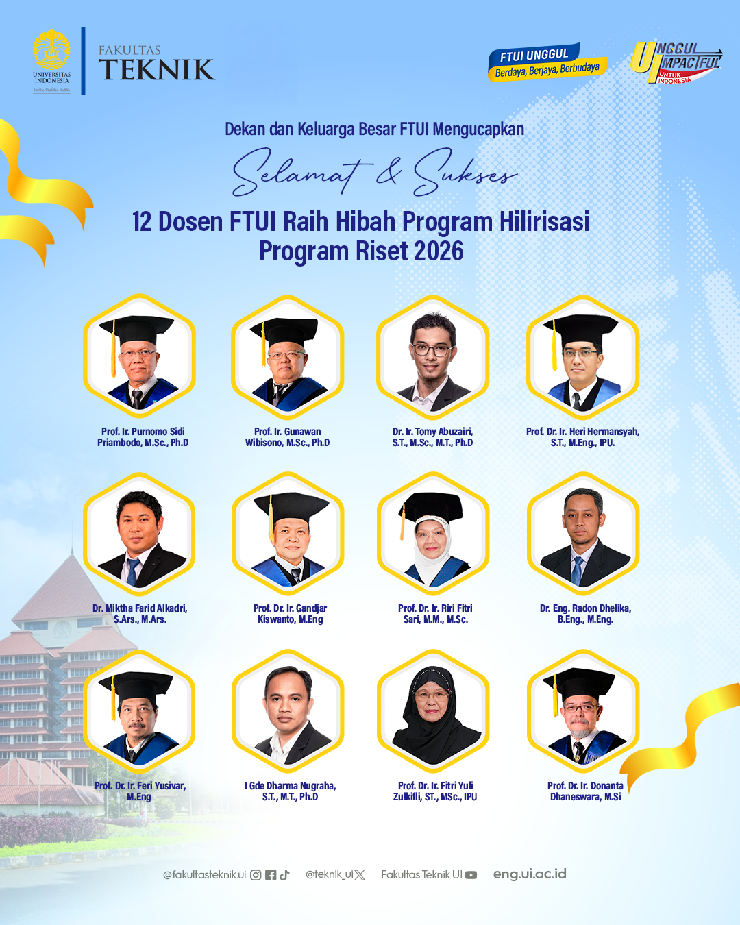 The Faculty of Engineering, Universitas Indonesia (FTUI) has once again demonstrated its commitment to fostering innovation and research downstreaming through the success of several lecturers and researchers selected as recipients of the 2026 Priority Research Downstreaming Program. A total of 12 FTUI lecturers have been awarded grants under this program, which is implemented through the...