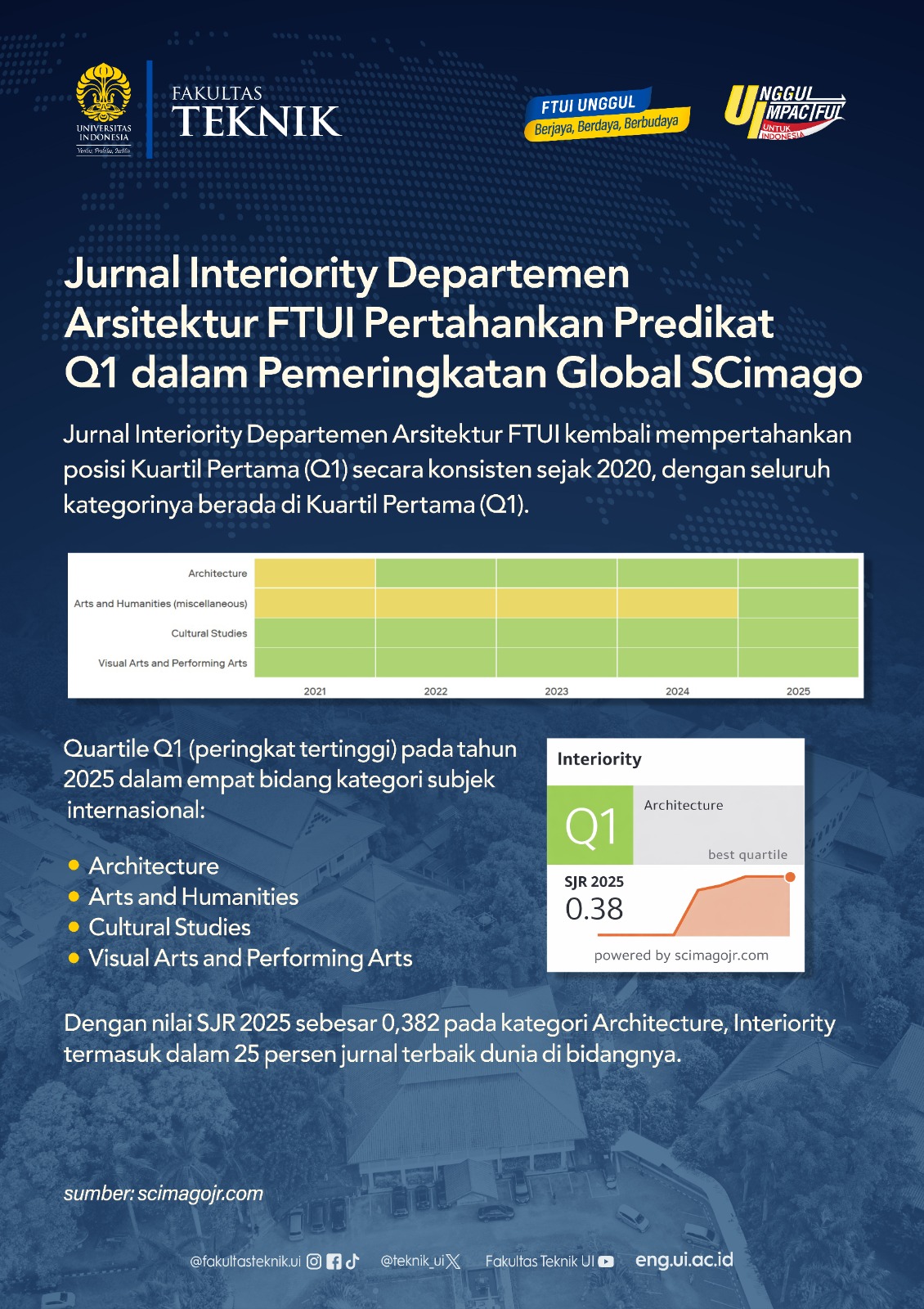 The Faculty of Engineering, Universitas Indonesia (FTUI), has once again demonstrated its commitment to advancing high-quality, globally reputable scientific publications. Based on the latest ranking by SCImago Journal Rank (SJR), Interiority, a scientific journal managed by the Department of Architecture FTUI, has achieved an outstanding milestone by maintaining its position in the first quartile (Q1)...