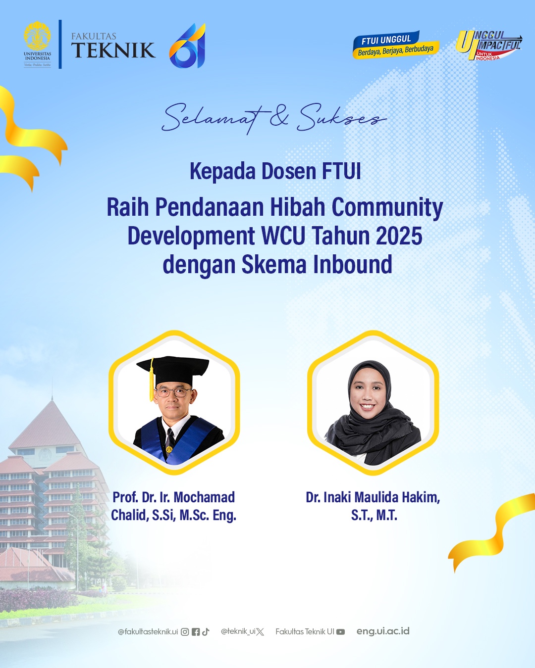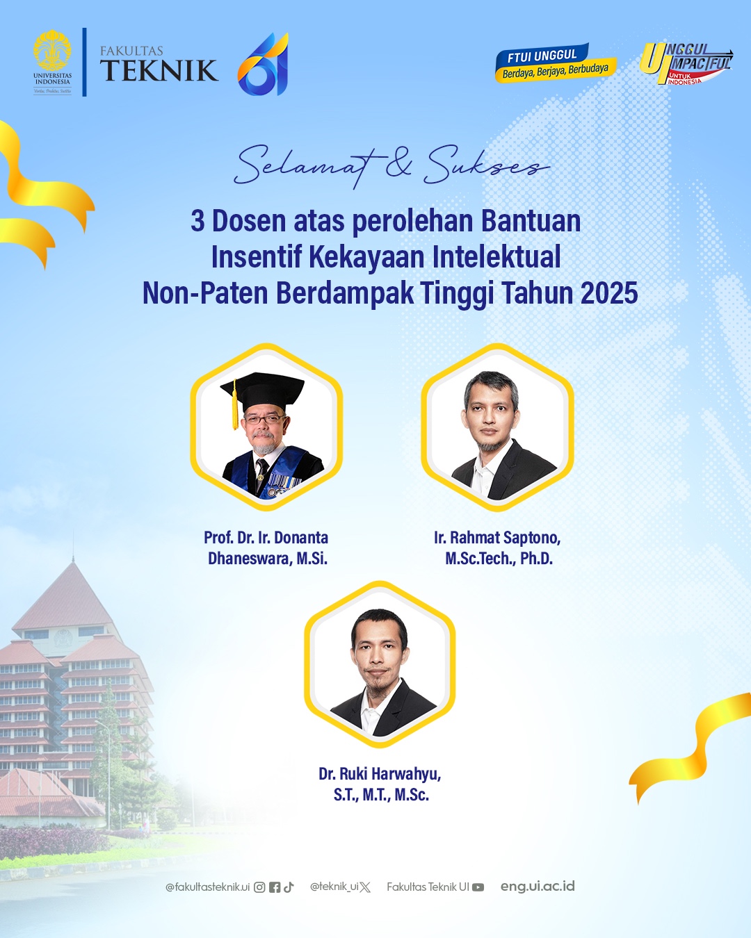 Fakultas Teknik Universitas Indonesia (FTUI) memberikan apresiasi kepada para peneliti dan inovator yang berhasil memperoleh pendanaan riset dan insentif pada tahun 2025. Dukungan ini berasal dari tiga skema pendanaan utama: Bantuan Insentif Kekayaan Intelektual 2025 dari Kemendiktisaintek, Hibah Community Development WCU 2025 dari DPIS-UI, dan Hibah Innovation Grant 2025 dari internal FTUI.