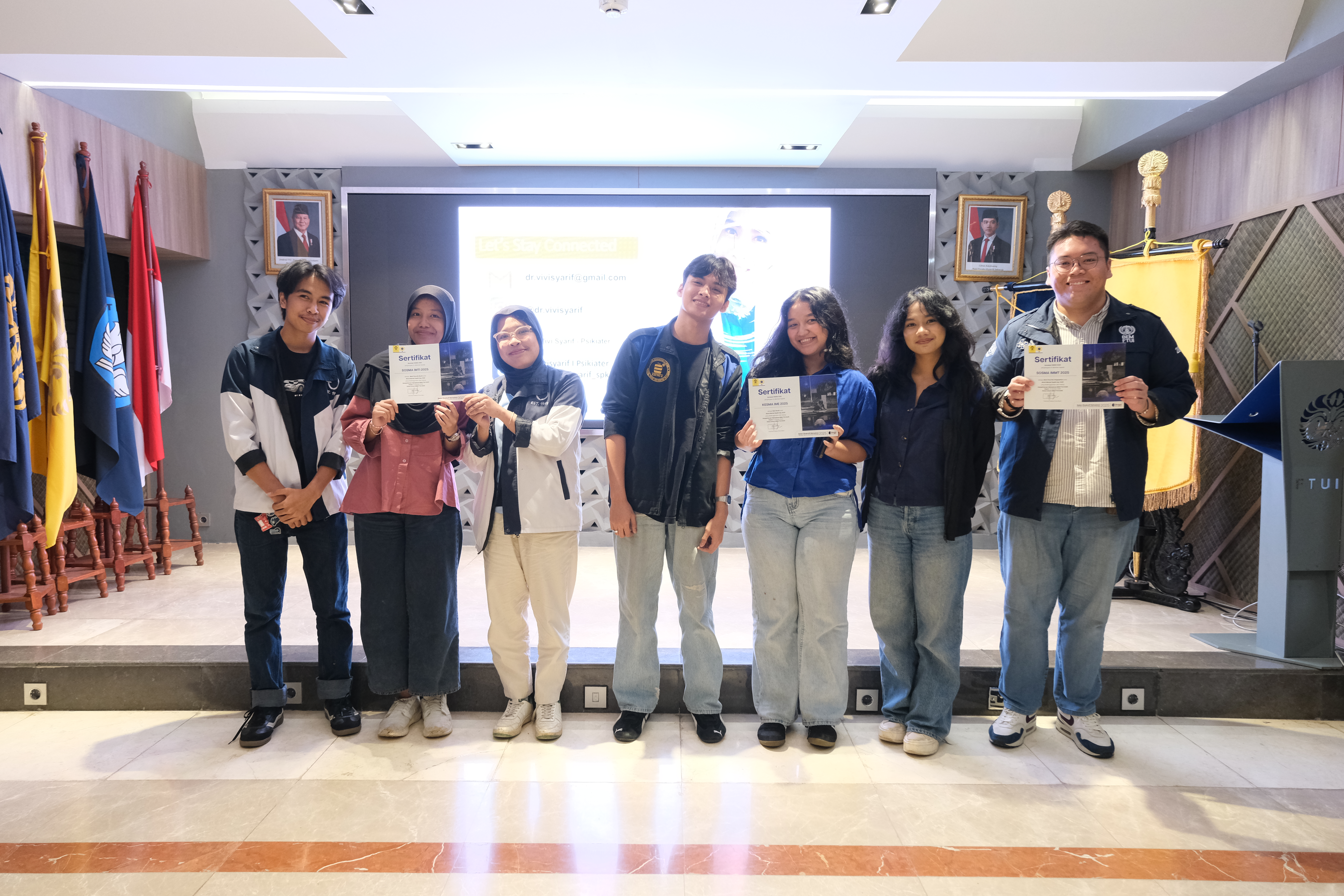 Dalam sesi utama seminar, dr. Zulvia Oktanida Syarif, Sp.KJ., atau yang akrab dipanggil Dokter Vivi, menyatakan bahwa berdasarkan data pada (PDSKJI, 2024), satu dari tiga mahasiswa Indonesia mengalami gejala cemas atau depresi. Hal ini dapat terjadi karena mahasiswa mengalami tekanan akademik dan sosial yang tinggi. Kondisi kesehatan mental yang umum dialami mahasiswa di antaranya, stres, burnout, kecemasan, dan depresi.