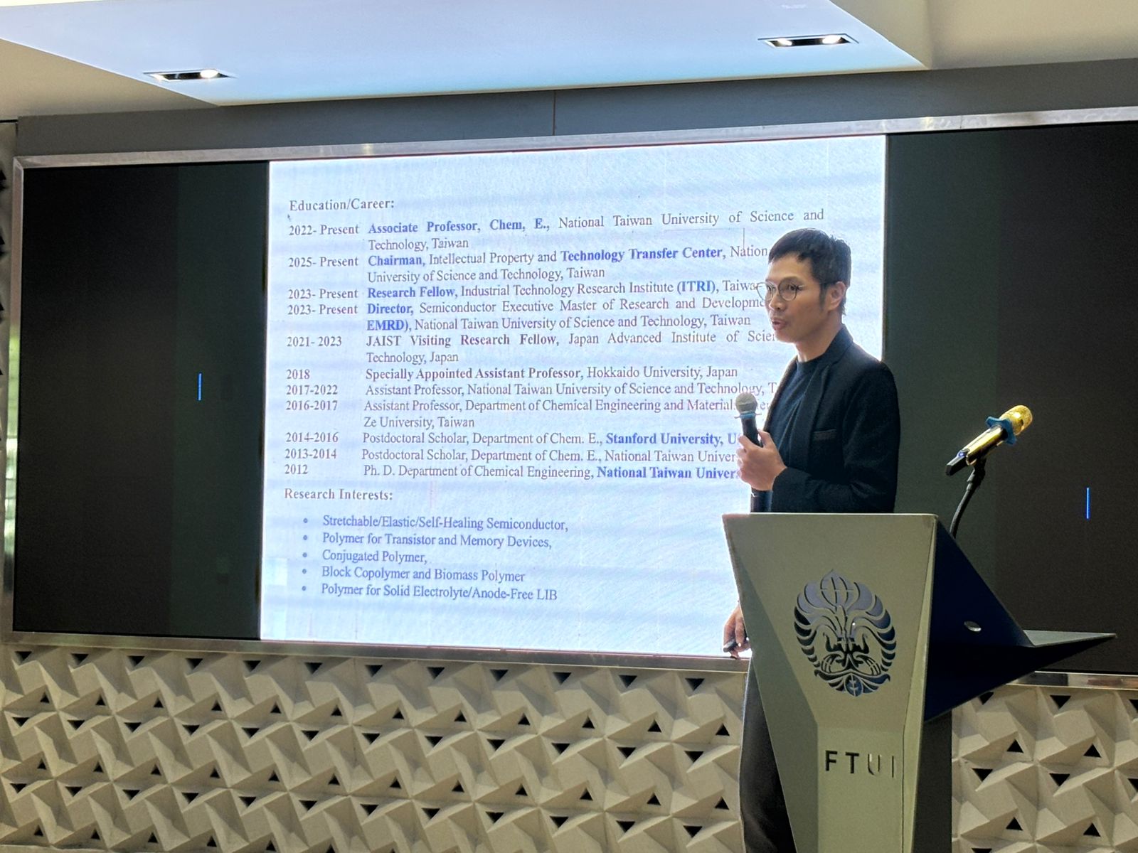 Fakultas Teknik Universitas Indonesia (FTUI) kembali menjadi tuan rumah kuliah tamu internasional bertajuk “A Research Journey – Having Fun in Polymer-based Transistor Memory” yang disampaikan oleh Dr. Yu-Cheng Chiu, Associate Professor dari Department of Chemical Engineering, National Taiwan University of Science and Technology (NTUST). Kuliah dilaksanakan di Makara 04 Smart Meeting Room, Gedung Dekanat pada Rabu (29/10).