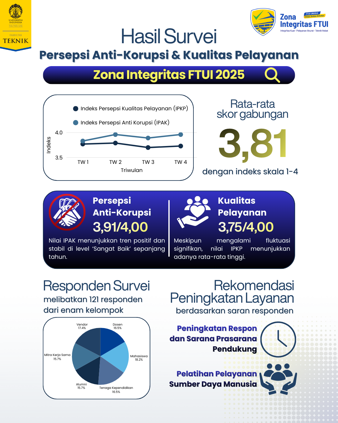 Pengimplementasian upaya Fakultas Teknik diawali dengan membangun birokrasi yang bersih dan bebas dari korupsi, kolusi, dan nepotisme (KKN). Hal ini berhubungan dengan maraknya kasus KKN yang terjadi di Indonesia sehingga mempengaruhi kepercayaan publik. Birokrasi yang bersih dan bebas dari KKN dilakukan oleh FTUI dengan menerapkan Wilayah Zona Integritas di lingkungan fakultas. Adapun sasaran dari penerapan Zona Integritas ini adalah terciptanya tata kelola dan budaya birokrasi anti korupsi serta sumber daya manusia yang profesional dan berintegritas. Selain itu, FTUI juga membentuk Tim Zona Integritas dalam rangka menuju Wilayah Bebas Korupsi (WBK) dan Wilayah Birokrasi Bersih dan Melayani (WBBM). Tim Zona integritas ini akan melakukan perencanaan, pelaksanaan, dan pengawasan dalam membangun WBK-WBBM dengan fokus pada 6 pengungkit.